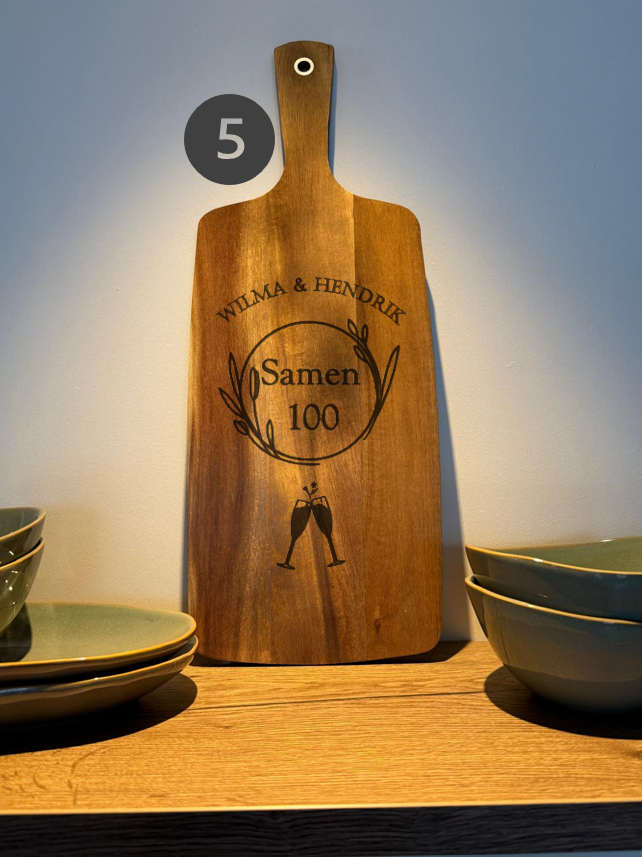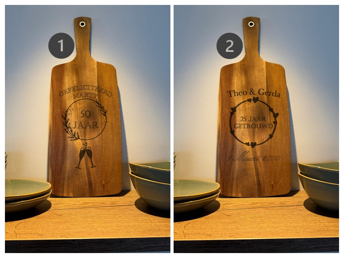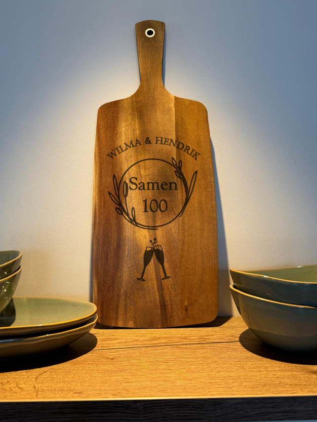Borrelplank met persoonlijke tekst, ontwerp of foto gegraveerd. Acacia houten serveerplank, donkerbruin, 20,5 x 52 cm. Kies uit de genummerde standaard ontwerpen en geef een eigen tekst door of bedenk je eigen ontwerp!