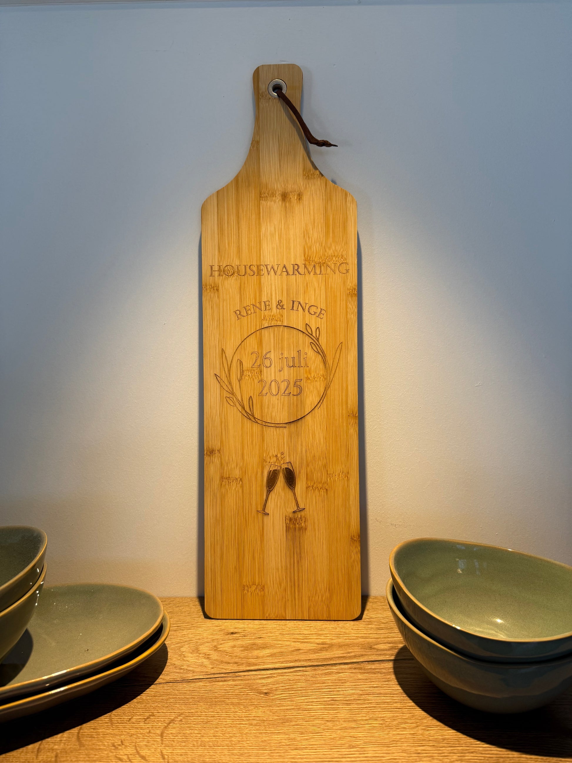 Borrelplank met persoonlijke tekst, ontwerp of foto gegraveerd. Bamboe houten serveerplank, lichte kleur, 57 x 16 x 1 cm. Kies uit de genummerde standaard ontwerpen en geef een eigen tekst door of bedenk je eigen ontwerp!