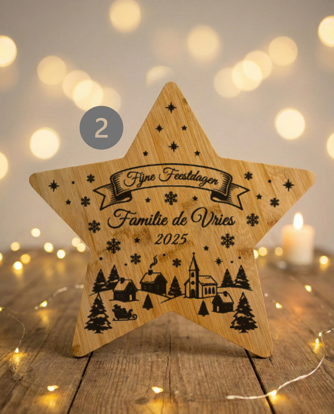 Kerstachtige borrelplank met persoonlijke tekst, ontwerp of foto gegraveerd. Bamboe houten borrelplank, lichtbruin, 34 cm. Kies uit de genummerde standaard kerstontwerpen en geef een eigen tekst door of bedenk je eigen ontwerp!